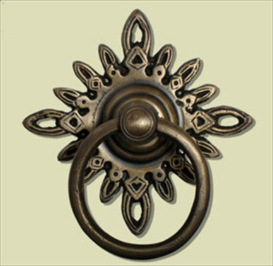 Handcrafted Hardware HRP5012: 3" Ring Pull with Star Backplate in Unlacquered Antique Brass finish. Forged in solid brass, this ring pull with a beautiful shining star design backplate. A truly stunning piece of cabinet hardware. Mounting hardware included. Standard finish is unlacquered Antique Brass. Other finishes are available by special order. Other finishes include: Polished Brass, Polished Nickel, Brushed Nickel, Antique Copper, Verdigris, Copper, Antique Black, Polished Chrome and Brushed Chrome. A 40% upcharge to the MSRP list price is charged, a minimum order of 5 pieces is required and special orders are non-refundable. Expect a 4 to 8 week lead time for special orders. Please contact Customer Service for assistance with special orders.