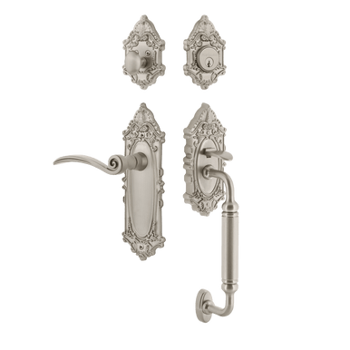 Nostalgic Warehouse 771490: Entry Door Lockset with Victorian Backplate, C-Grip Exterior Handle and Swan Interior Lever in Satin Nickel finish. The Victorian Exterior Handleset, with its distinct curvilinear embellishment, is unmistakably old world vogue. All Nostalgic Warehouse handlesets are mounted on a solid (not plated) forged brass base for durability and beauty. Easy to install in modern, pre-drilled doors.