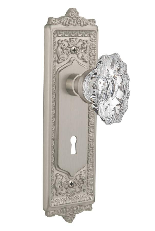 Nostalgic Warehouse 713977: Egg & Dart Collection Backplate with Chateau Knob Privacy Door Set in Satin Nickel finish. With its distinctive repeating border detail, as well as floral crown and foot, the Egg & Dart Plate resonates grand style and is the ideal choice for larger doors. Add our Chateau crystal door knob, with its distinctive shape and brilliant sparkle, this unique oval crystal door knob adds an elegant accent to any door.