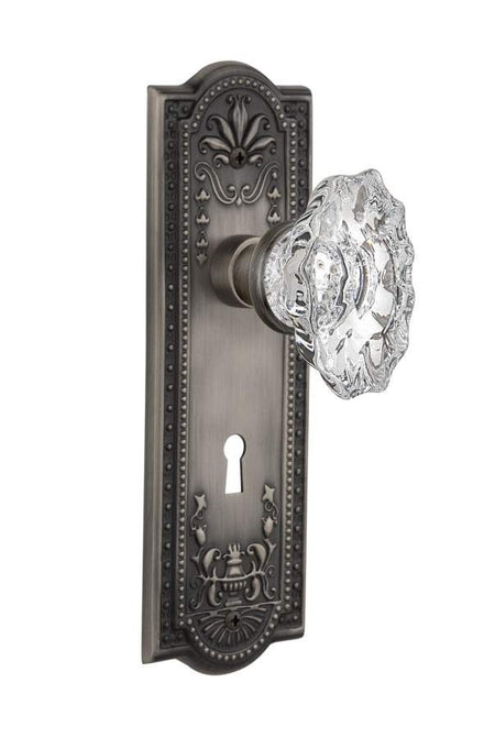 Nostalgic Warehouse 713980: Meadows Collection Backplate with Chateau Knob Privacy Door Set in Antique Pewter finish. The Meadows Plate, with its intricate beaded detailing and botanical flourishes, creates an inspired design theme. Add our Chateau crystal door knob, with its distinctive shape and brilliant sparkle, this unique oval crystal door knob adds an elegant accent to any door.