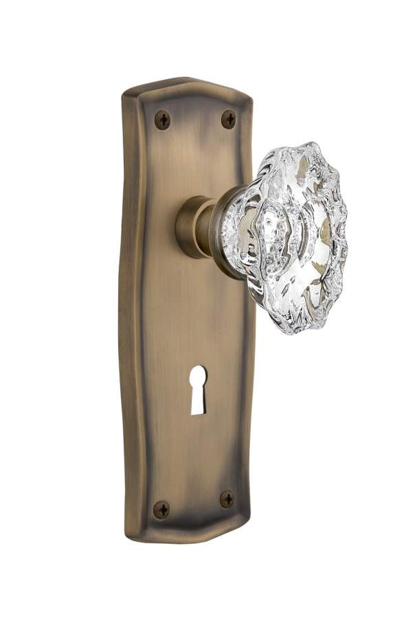 Nostalgic Warehouse 713992: Prairie Collection Backplate with Chateau Knob Privacy Door Set in Antique Brass finish. The quiet, discerning restraint of the Prairie Plate evokes a spirit reminiscent of the Craftsman style. Add our Chateau crystal door knob, with its distinctive shape and brilliant sparkle, this unique oval crystal door knob adds an elegant accent to any door.