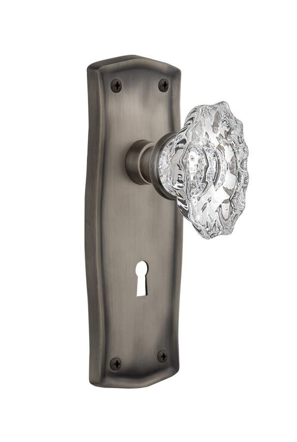 Nostalgic Warehouse 713993: Prairie Collection Backplate with Chateau Knob Privacy Door Set in Antique Pewter finish. The quiet, discerning restraint of the Prairie Plate evokes a spirit reminiscent of the Craftsman style. Add our Chateau crystal door knob, with its distinctive shape and brilliant sparkle, this unique oval crystal door knob adds an elegant accent to any door.
