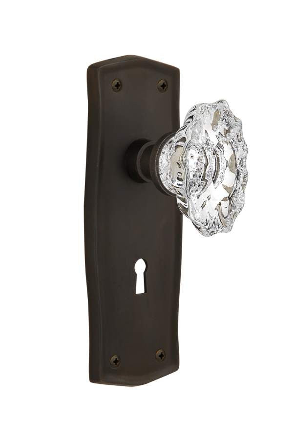 Nostalgic Warehouse 713994: Prairie Collection Backplate with Chateau Knob Privacy Door Set in Oil-Rubbed Bronze finish. The quiet, discerning restraint of the Prairie Plate evokes a spirit reminiscent of the Craftsman style. Add our Chateau crystal door knob, with its distinctive shape and brilliant sparkle, this unique oval crystal door knob adds an elegant accent to any door.