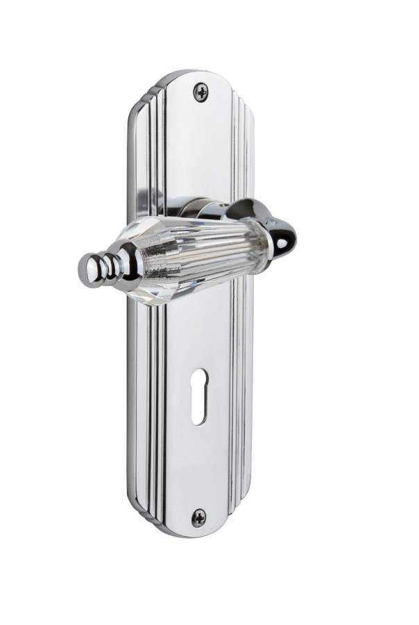 Nostalgic Warehouse 714124: Deco Collection Backplate with Parlour Lever Passage Door Set in Bright Chrome finish. The Deco Plate brings to mind old Hollywood, jazz, and The Great Gatsby, all of which inspire a modern twist on great classics from the past. Combine this with Parlour crystal lever to strike a lovely note throughout your entire home. All Nostalgic Warehouse levers are mounted on a solid (not plated) forged brass base for durability and beauty.
