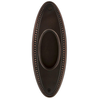 Nostalgic Warehouse 703698: 6-3/4" Oval Beaded Flush Door Pull in Timeless Bronze finish. The oval shape is fashionable, yet functional on pocket doors, sliding doors, cabinet doors or any door where a flush with the door face pull is needed. Solid brass. Mounting hardware included.